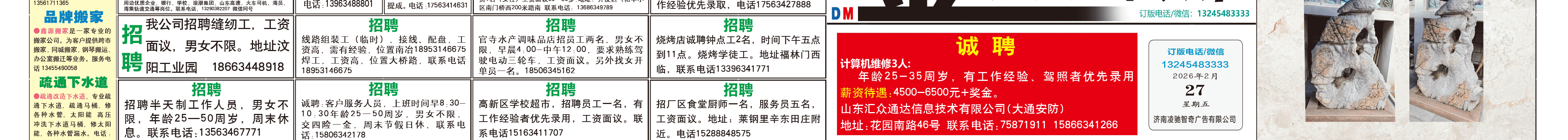 《萊蕪金點子廣告》報紙2月27日三、四版 http://m.bic34m.cn 發(fā)布日期:2026/2/27 9:07:32 文章作者:萊蕪金點子信息港