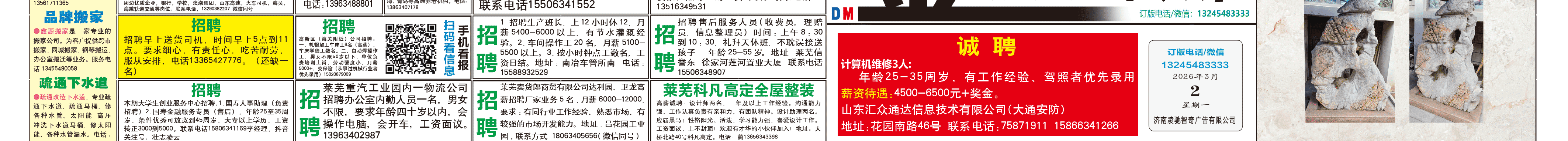 《萊蕪金點(diǎn)子廣告》報紙3月2日三、四版 http://m.bic34m.cn 發(fā)布日期:2026/3/2 8:43:22 文章作者:萊蕪金點(diǎn)子信息港